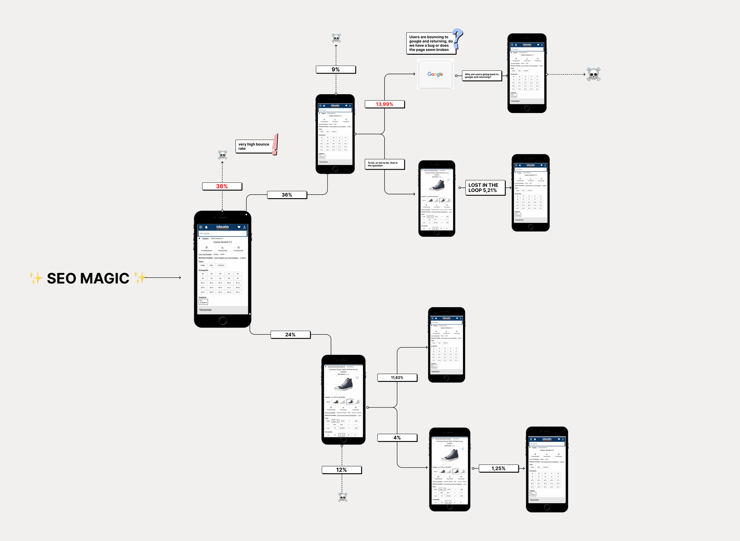 Looking for the right lever, we (me + PO) scanned the performance data of all product categories during the last black friday, looking for something with high incoming traffic and low conversion. And we found it: in particular sneakers, followed by fashion. On a deeper look, it became very clear: anything with sizes, on smaller viewports!